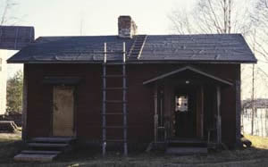 MODEL HOUSE TRUSS questions the relationship between support and vulnerability within domestic structures and draws from Johnson’s intervention (1996) in the ‘Model House’ section of the Pielisen Museum in Lieksa, Finland. The diptych intervention becomes the central image of the triptych.